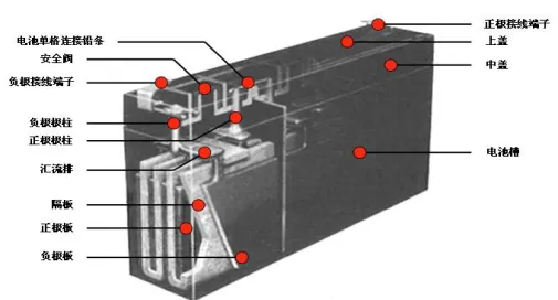 構(gòu)成閥控鉛酸蓄電池的主要部件是正負(fù)極板、電解液、隔板、電池殼和蓋、安全閥,此外還有一些零件如端子、連接條、極柱等。